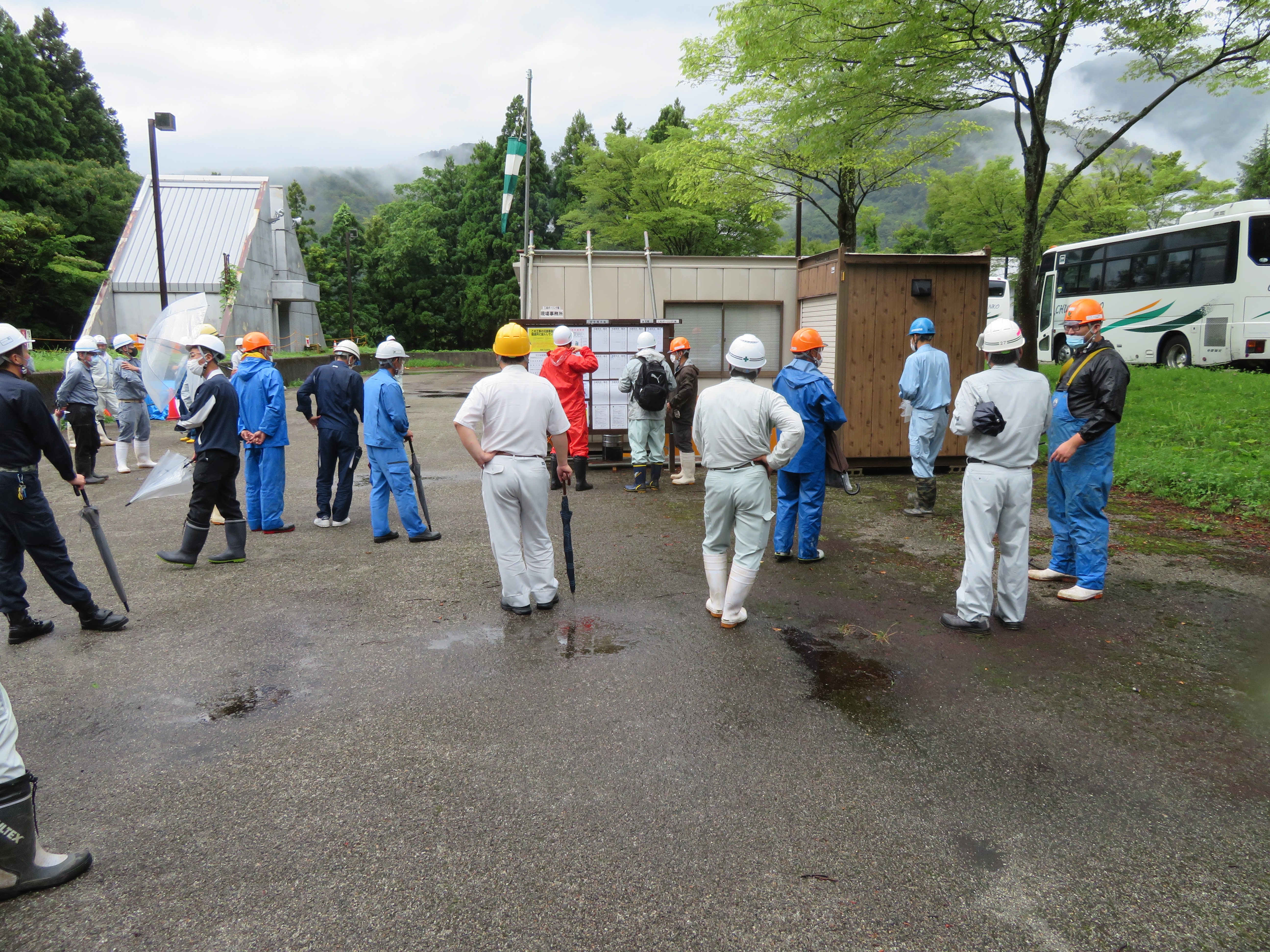 現場では、設置済みのアンカーが周辺環境に紛れて見にくいため、転倒事故を誘発する恐れがあるとして、アンカーの突起部分に対策を講じるよう意見があった他、現場事務所では安全・健康対策の良い事例が多く見受けられ、講演会場に戻ってからの講評でも、参加の皆さんに紹介されていた。