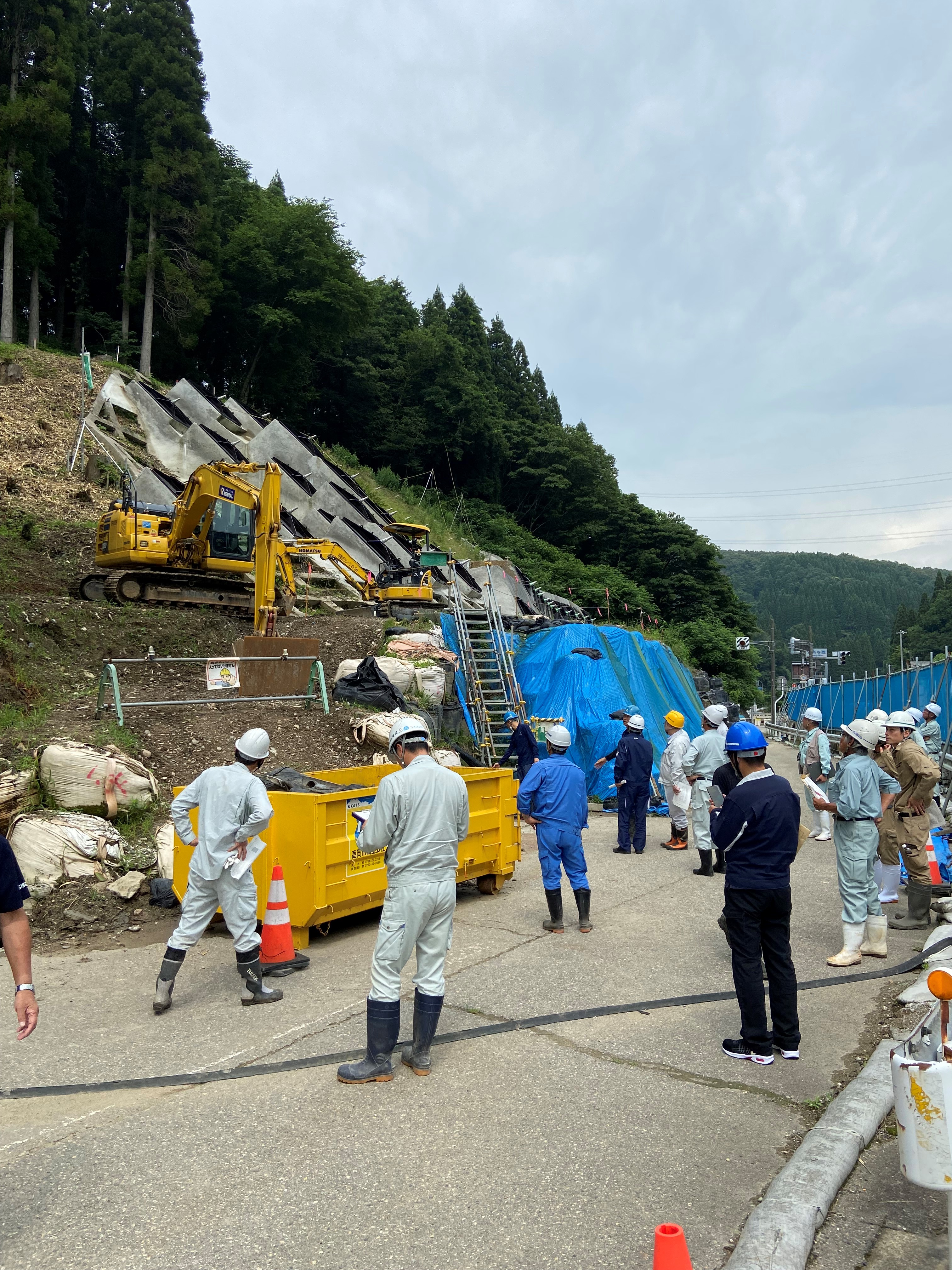大型土のうの撤去作業が予定されていたが、上下作業の防止、熱中症対策、階段手摺の状況などについて確認・指導した。