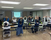 ストレスについて、「環境や心理的、身体的な要素から心や体が感じるプレッシャーである」と定義し、対処法として良い睡眠、バランスのとれた食事、ウォーキングなどの運動を挙げた。また、自身や周りの人が症状を感じた場合は、専門家に相談するよう呼び掛けた。 講演の途中には座ったままできるストレッチを全員で行い、効果を実際に体験する場面もあった。 |