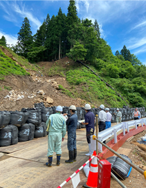 現場事務所から工事場所の移動途中では、乗用車2台にしっかりと車止めがなされており座学で学んだことが実行されていると評価を受けました。工事場所では、バックホーによる大型土のうの設置方法や重機の検査済証の確認などが行われました。