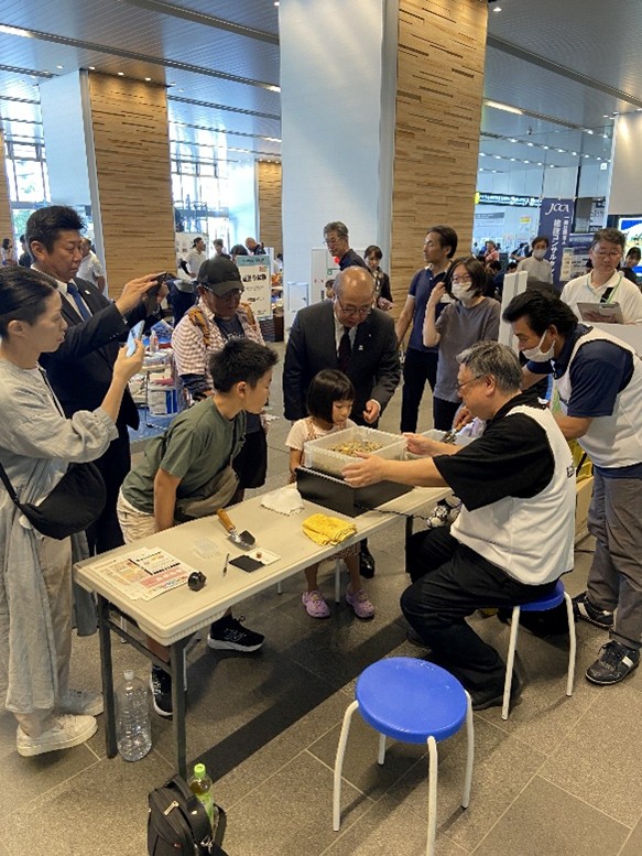 展示時間の始まりには新田知事様も訪問され、一般の見学者とともに液状化の模型実験 を興味深そうにご覧になっておられました。