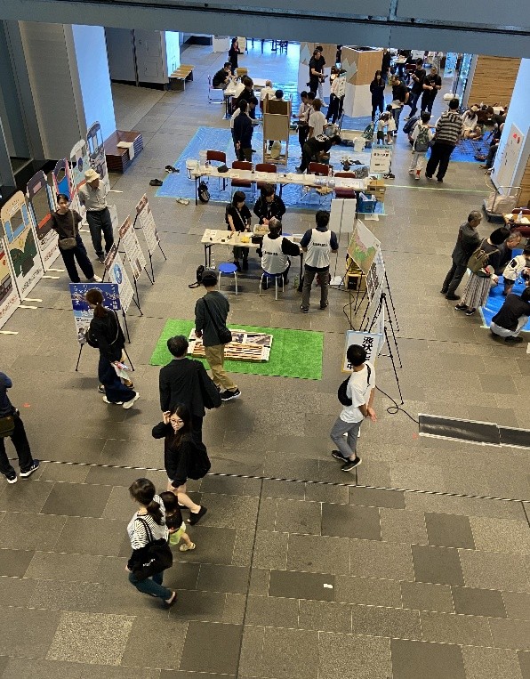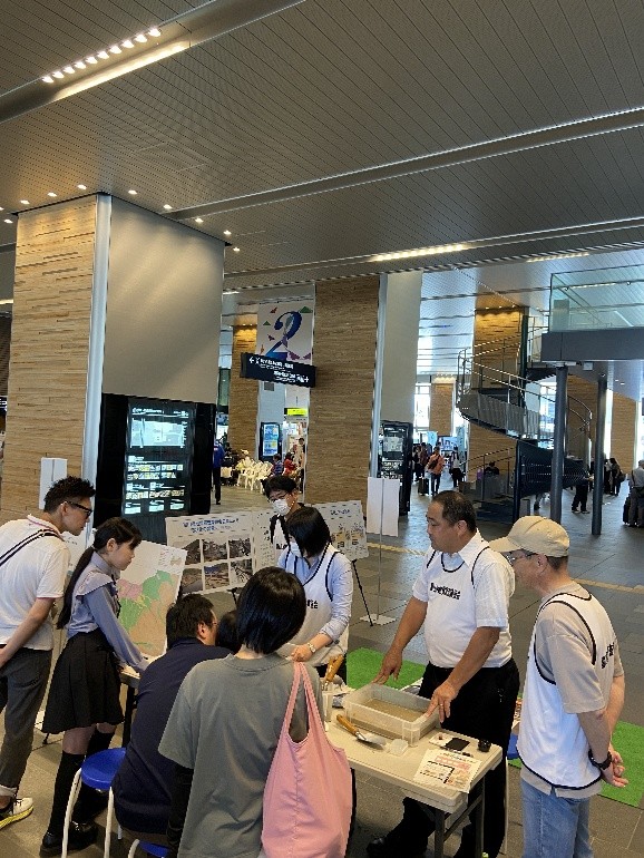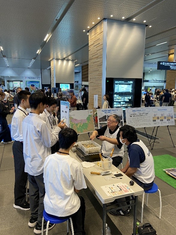 〇協会からは、5m×5mのブースエリアにおいて、地震による液状化現象の再現実験、地質調査の役割を紹介するパネル展示、液状化現象に関するパネル展示を行いました。